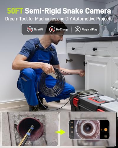 - Cable flexible y de forma fija: El cable semirrígido de 50 pies ofrece comodidad y control durante el funcionamiento, eliminando la molestia de administrar la longitud excesiva del cable. La cámara de serpiente proporciona un equilibrio perfecto de rigidez y flexibilidad, lo que le permite doblarla y darle forma manualmente mientras mantiene su forma.