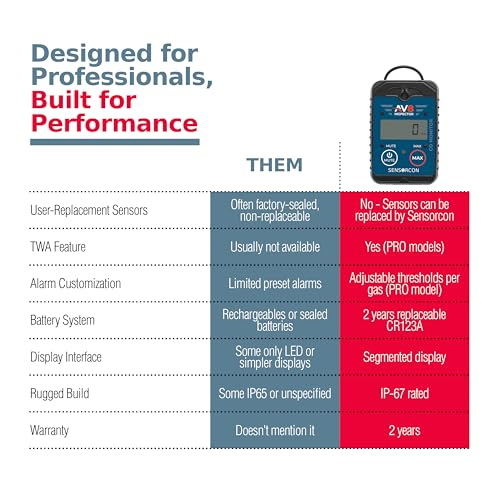 - Construcción duradera y lista para el campo: diseñados para soportar entornos de aviación difíciles, los detectores de CO portátiles Sensorcon AV8 cuentan con una carcasa compacta, resistente a los golpes y resistente al agua con clasificación IP67, ideal para cubiertas de vuelo, hangares y zonas de mantenimiento.