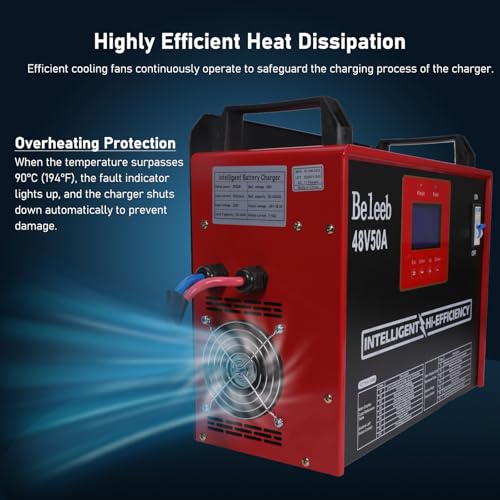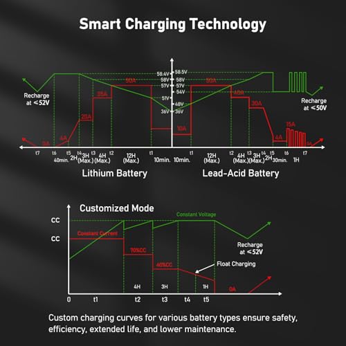 - Modos de carga versátiles: Cargue de forma segura las baterías de plomo-ácido y litio con modos de carga dedicados, asegurando un rendimiento óptimo y una extensión de la duración de la batería. Nota: dado que este cargador es personalizable y funciona con varias baterías de 48V, si el enchufe Anderson de 175A incluido es incompatible con su batería, puede reemplazarlo con un enchufe compatible comprado por separado
