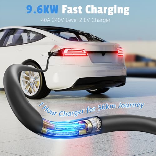 - Pantalla inteligente LED y control de aplicaciones: el cargador Tesla de nivel 2 con una pantalla LED de 2.8 pulgadas. Te permite ajustar fácilmente la corriente de carga de 8 a 40 amperios (8/10/13/16/20/24/32/40A). Además, puedes administrar la carga de forma remota utilizando la aplicación, que proporciona monitoreo de tiempo, ajuste de energía y reserva de temporizador.
