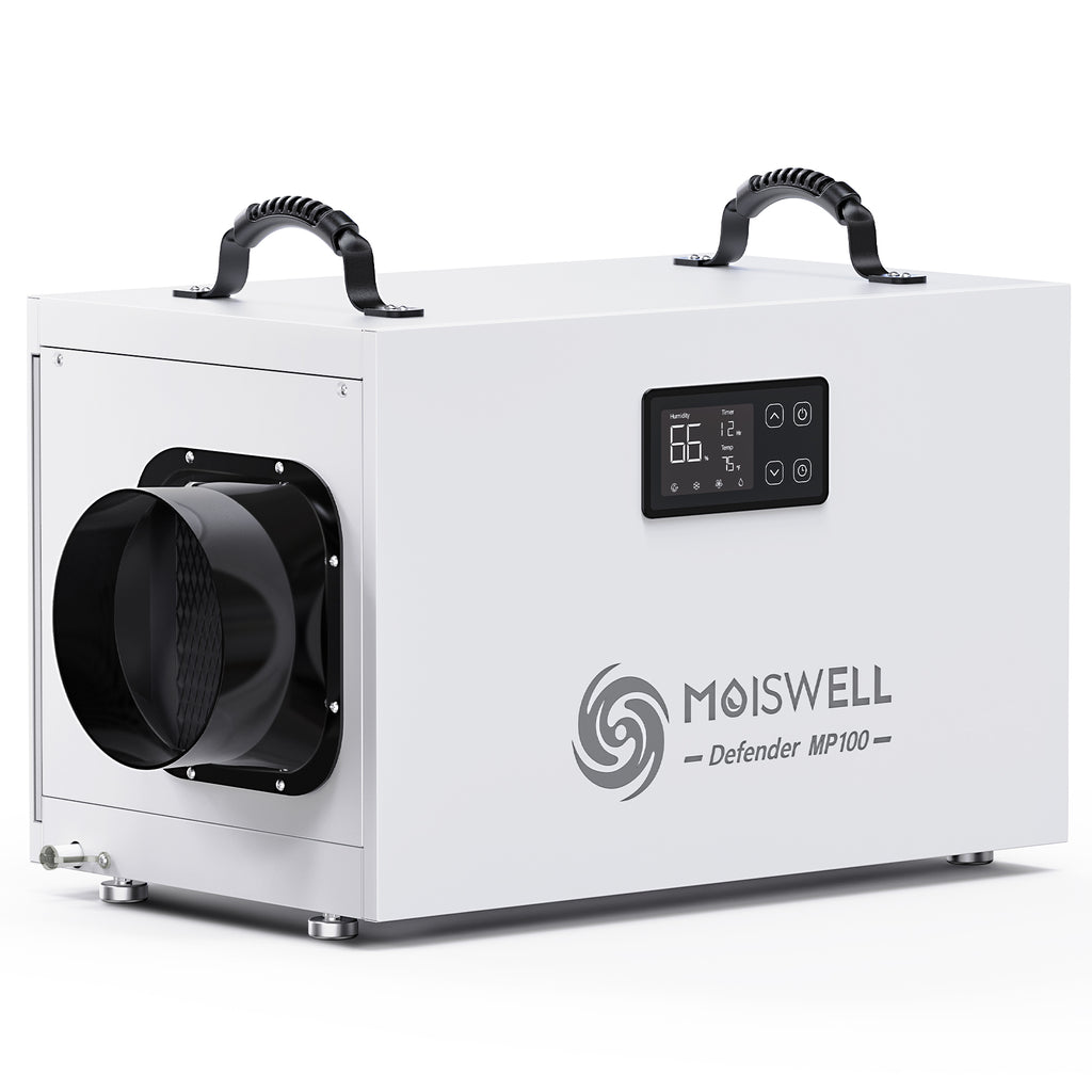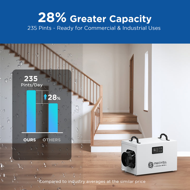 Deshumidificador comercial de 235 pintas con bomba y manguera de drenaje para sótanos y espacios reducidos | MOISWELL Defender MP100