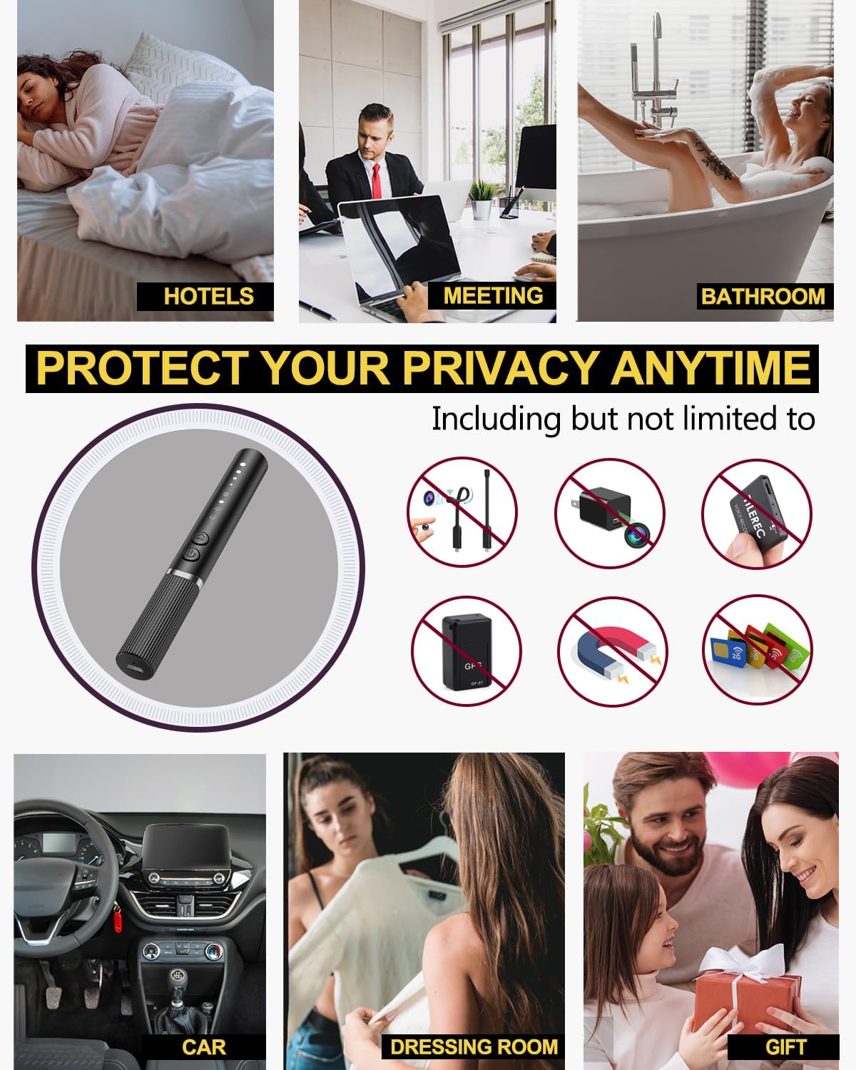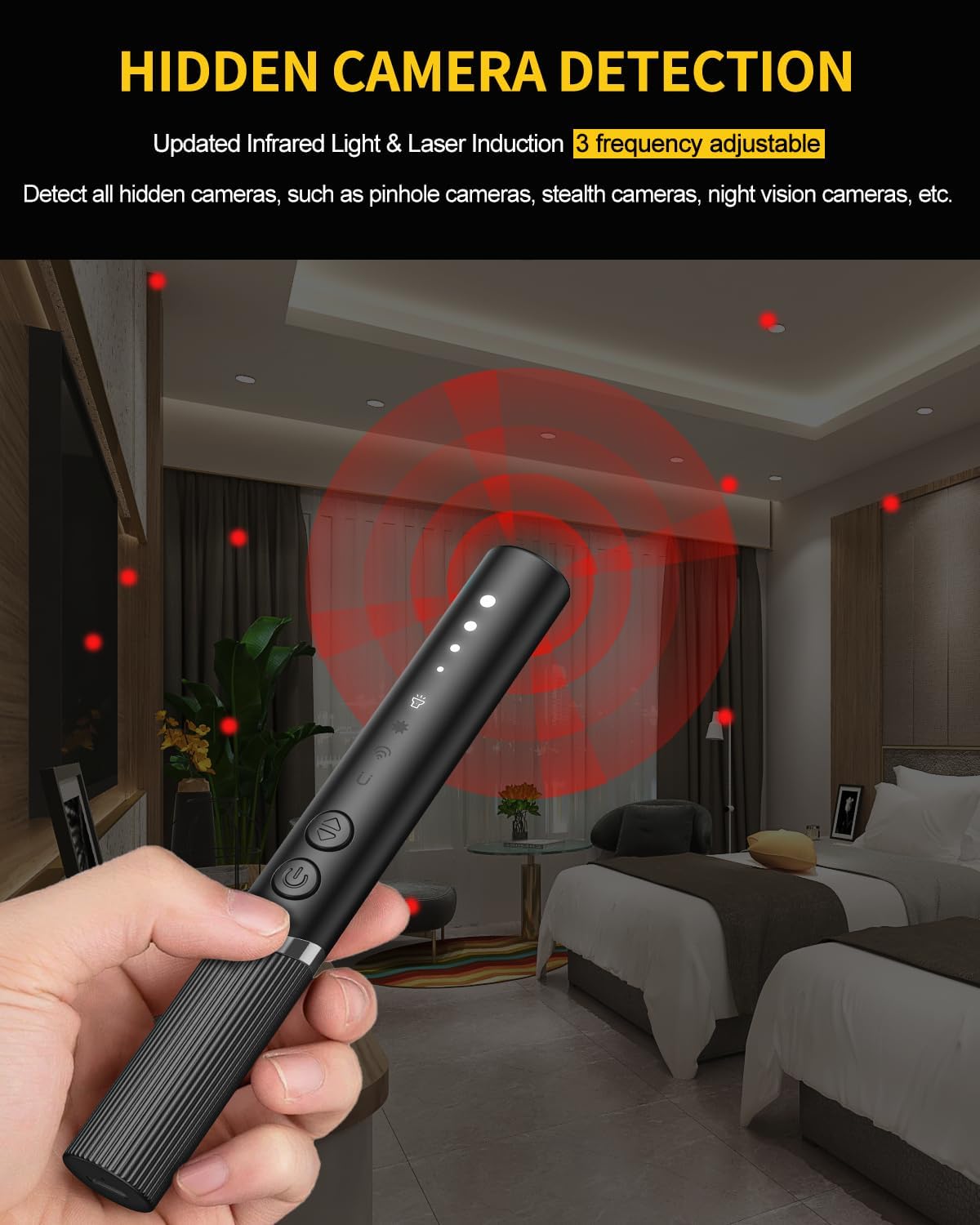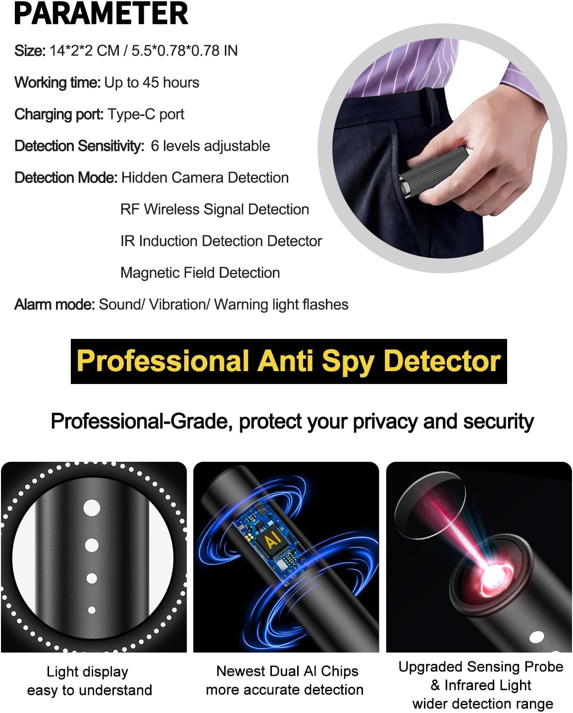 - Más rápida y precisa: la última generación de chips AI y luz infrarroja, las tecnologías de sensores se basan en la demanda del mercado, el detector de errores y cámaras ocultos diseñado para tu privacidad, hace posible encontrar cámaras ocultas, dispositivos de escucha y grabación, errores ocultos, rastreadores GPS, etc