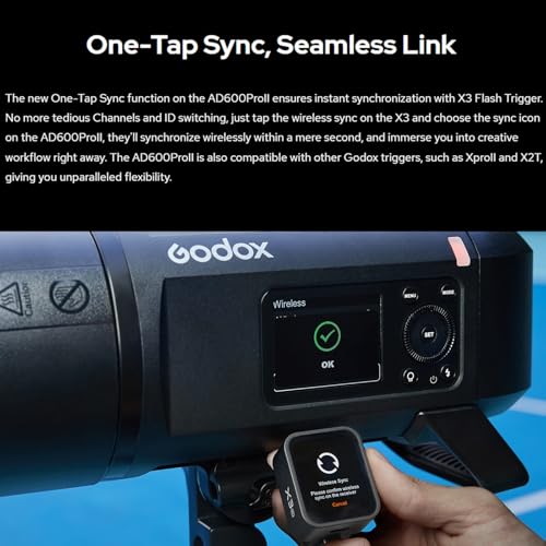 - 【2.4G inalámbrico y TTL】600 W de potencia. El AD600ProII cuenta con un tiempo de reciclaje extremo de 0.01 a 0.9 segundos. Además, admite sincronización de alta velocidad de hasta 1/8000 segundos. Con el sistema inalámbrico Godox 2.4G, el AD600ProII se integra perfectamente con los sistemas de flash automático TTL en múltiples marcas de cámaras.