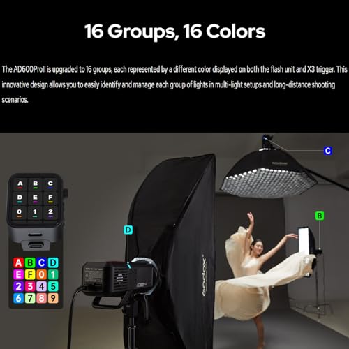 - Sincronización con un solo toque, 16 grupos, 16 colores: la nueva función de sincronización de un solo toque en el AD600ProII garantiza una sincronización instantánea con el disparador de flash X3. El AD600ProII se actualiza a 16 grupos, cada uno representado por un color diferente que se muestra tanto en la unidad de flash como en el disparador X3.
