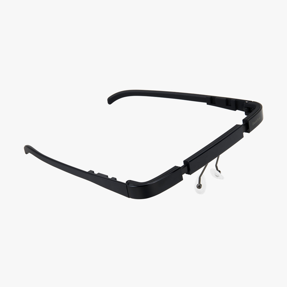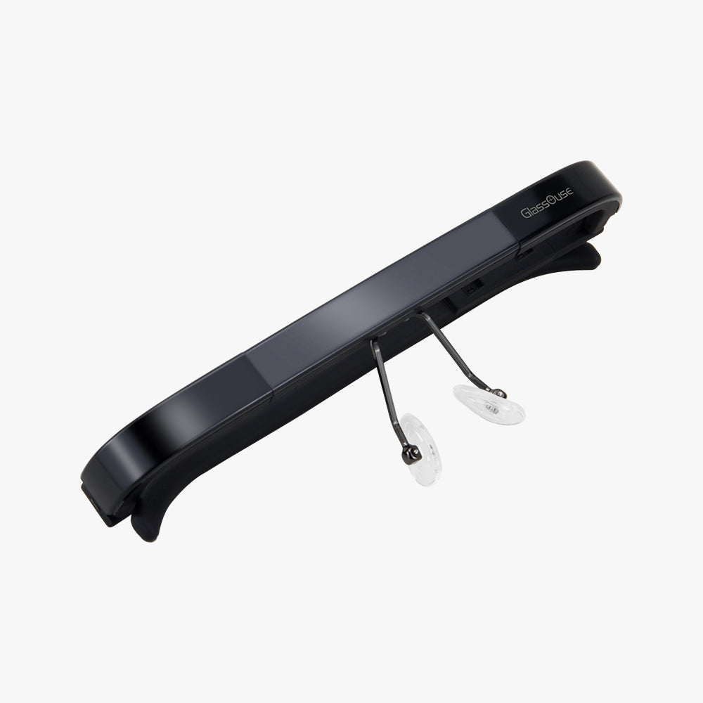 Al igual que una gafa normal, puede colocarse la montura G sobre la frente y enganchar GlassOuse a ambos lados en su cierre. Su longitud frontal puede ajustarse tirando hacia fuera o empujando hacia dentro para hacerla más firme y cómoda mientras se usa. También se puede llevar fácilmente sobre las gafas normales.