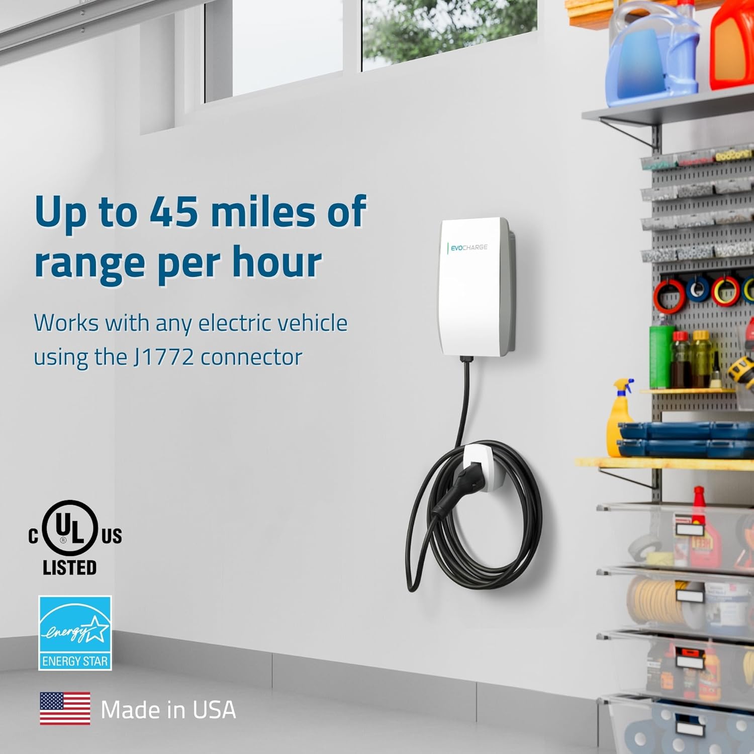 - Fabricado en los Estados Unidos. Carga de hasta 45 millas de alcance por hora: carga más rápida en casa que es rápida, flexible y fácil de usar.