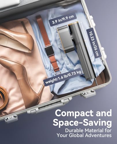 - Vaporizador portátil de tamaño de mano: el mini vaporizador portátil de viaje Jack & Rose es compacto y fácil de sostener, mide 10.23 x 3.9 pulgadas, 1.6 libras es consistente con una botella de agua mineral de 25.4 fl oz. Pero la función de eliminación de arrugas no es comparable a la del vaporizador de tamaño completo, el cabezal de vapor giratorio maximiza el espacio y es fácil de colocar en el estuche de viaje de la mochila. Bolsa de viaje de lujo para un fácil embalaje. El cable de 7.2 pies y la placa resistente al calor de alta temperatura son fáciles de usar.