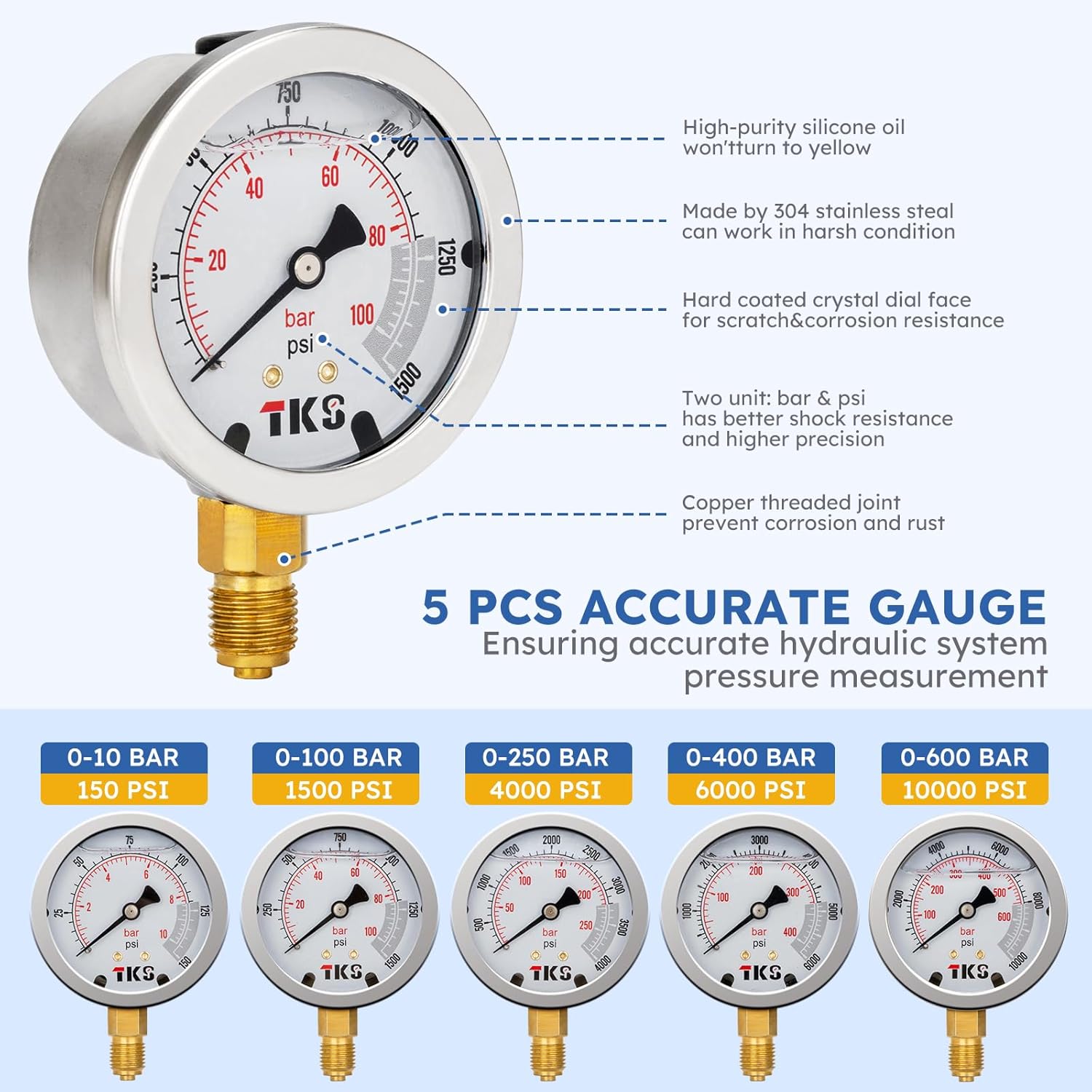 - ✔ Kit de prueba de presión hidráulica AilemeNova - Kit todo en uno: 12 acoplamientos de prueba AIKG, 14 conectores en T, 5 x medidor de prueba hidráulica, 1 conector rápido Carter, 1 estuche de almacenamiento portátil, 5 mangueras de prueba