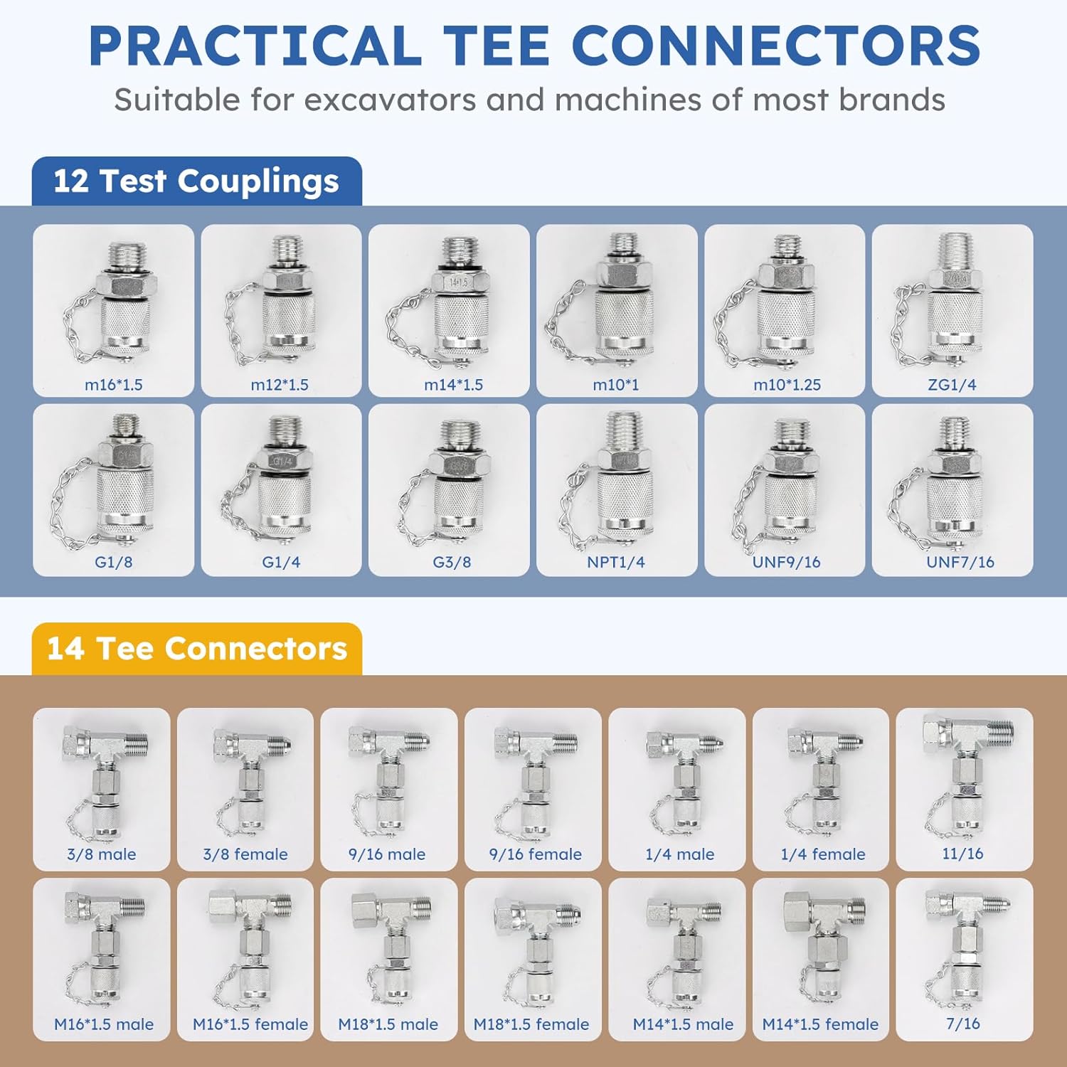 - ✔ Acoplamientos de prueba intercambiables y conectores en T: el kit de prueba hidráulica AilemeNova viene con un conjunto completo de accesorios, incluyendo 13 acoplamientos de prueba y 14 conectores en T, perfecto para la mayoría de los tipos de excavadoras, construcción, maquinaria, barcos o minas. Todos los acoplamientos están hechos de acero al carbono de alta calidad con alta resistencia y fiabilidad.