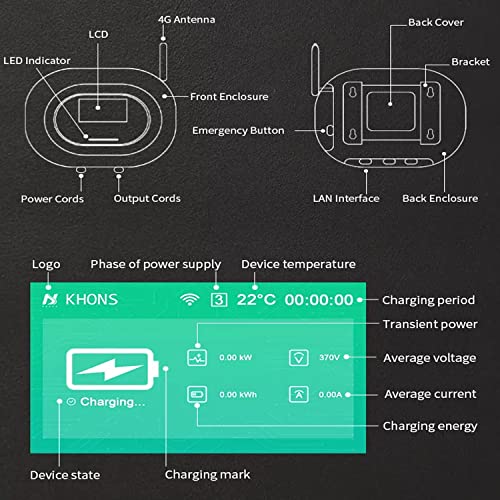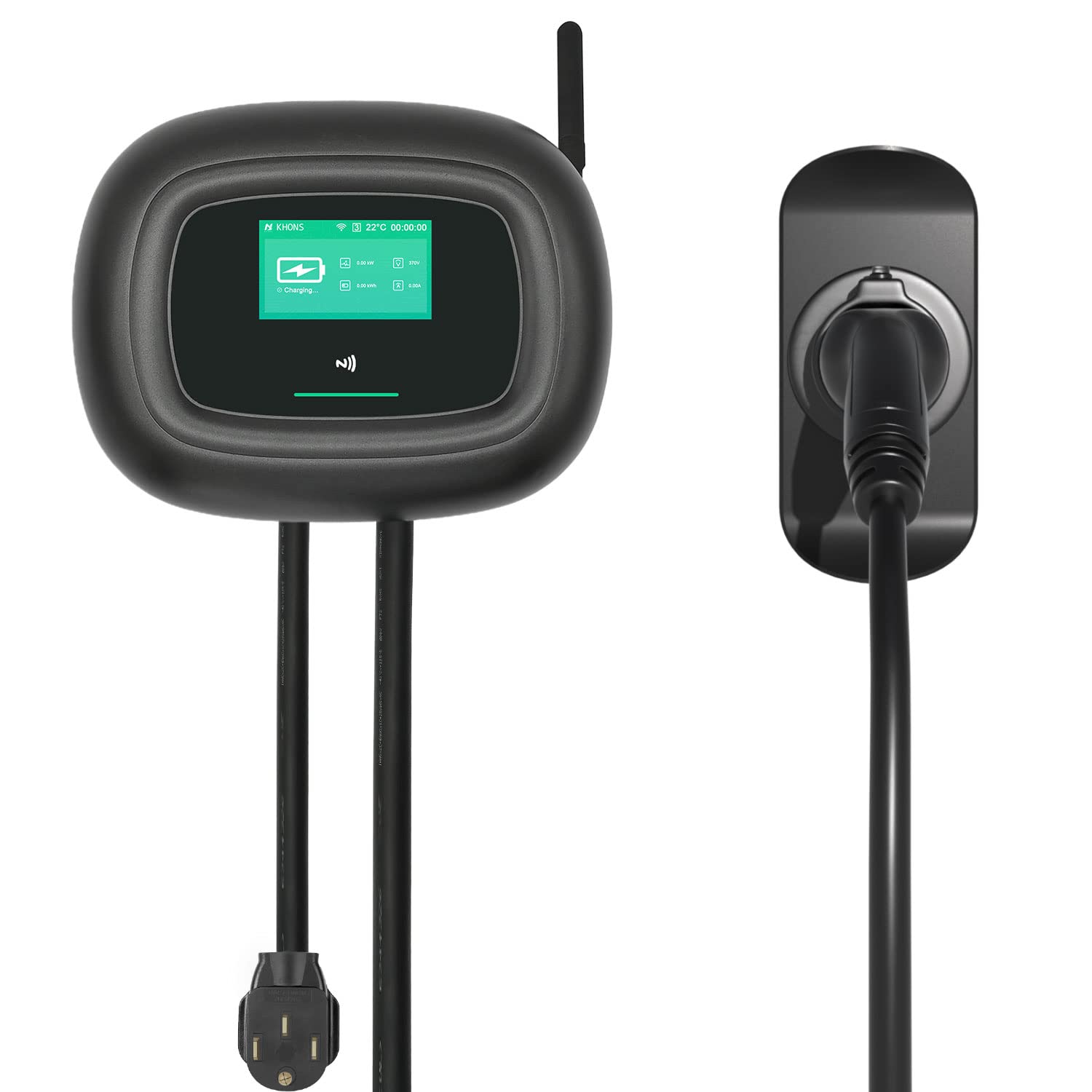 - Plug and Play: este cargador está listo para usar directamente fuera de la caja. La estación de carga EV requiere un receptáculo de enchufe NEMA 14-50 de 240 V. Todo lo que tienes que hacer es conectarlo a la toma de corriente. Las opciones de conectividad Wi-Fi, Ethernet, Bluetooth y 4G permiten optimizar la conectividad y la comunicación con tu dispositivo móvil. Simplemente descarga la aplicación Khons EV Charging desde Google Play Store para Android o la tienda de aplicaciones iOS para usuarios de iPhone
