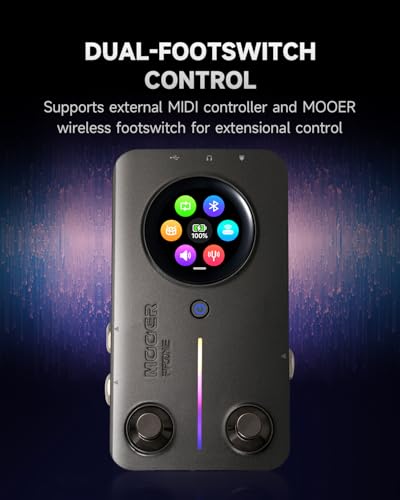- Nuevo diseño: la pantalla táctil se combina con control de interruptor de doble pie, soporta controlador MIDI externo y pedal inalámbrico MOOER para control de extensión