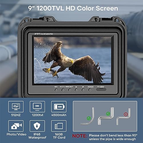 - Transmisor de sonda de 512 Hz: esta cámara de alcantarillado con localizador tiene un transmisor integrado de 512 Hz para ayudar a averiguar la ubicación rápidamente y se puede utilizar con cualquier receptor de 512 Hz (el receptor debe comprarse por separado). 9inch LCD DVR monitor puede proporcionar 1200tvl HD fotos/videos. Tarjeta TF incorporada de 16 GB para grabar y guardar imágenes. La función de recuento de distancia del cable le da una idea clara de la longitud.