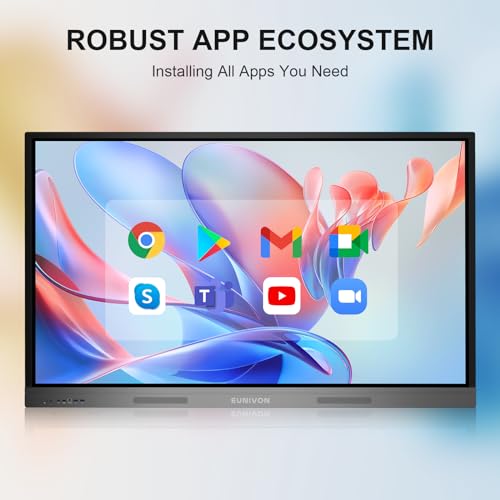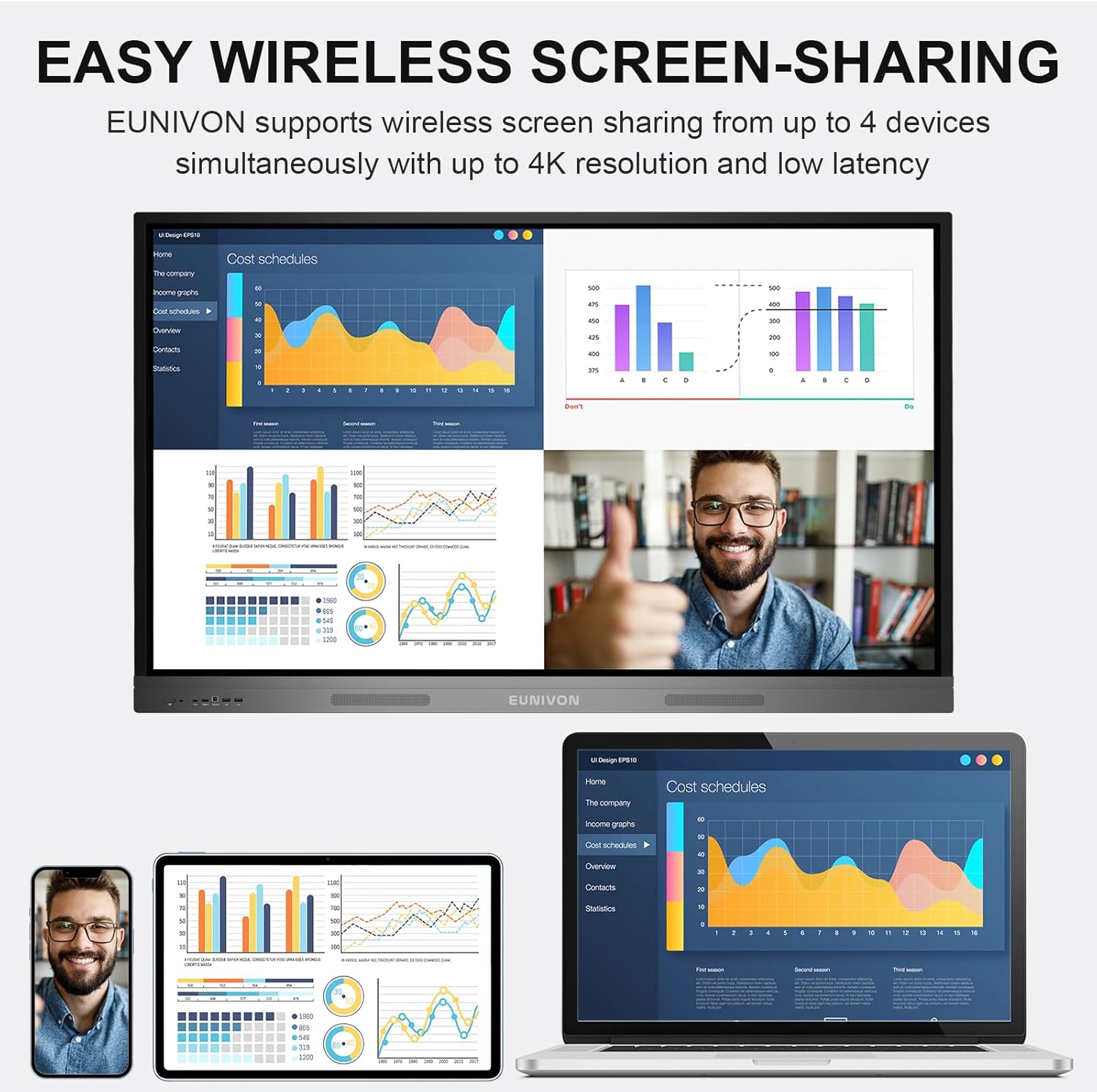 - Presentar y anotar: la pizarra interactiva EUNIVON te permite proyectar cualquier dispositivo Mac/Windows/iOS/Android, o conectarte a través de HDMI. Puede anotar en tableros inteligentes para el aula o la sala de reuniones según sea necesario, compartir a través de videoconferencias o fijar capturas de pantalla en la pantalla 4k de ultra alta definición de esta pizarra digital.