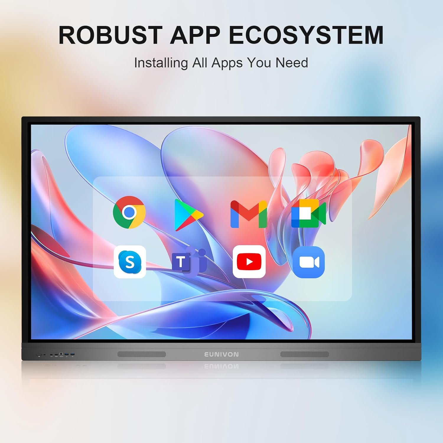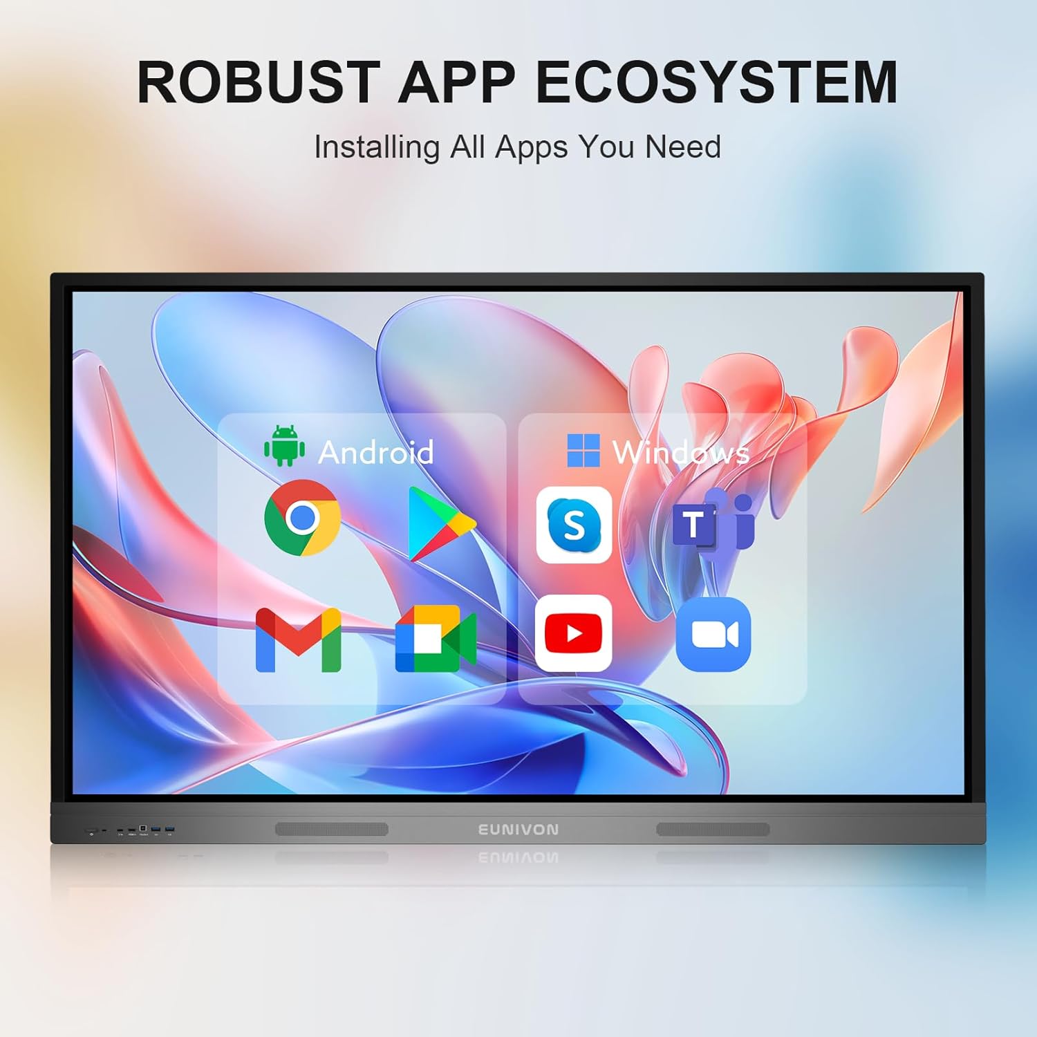 - Ecosistema de aplicaciones robusto: el ecosistema abierto de pizarra interactiva EUNIVON te permite elegir las aplicaciones que mejor se adapten a ti y a tu organización. Estas pizarras interactivas pueden satisfacer tus múltiples necesidades en el trabajo. El tablero digital puede brindarle una nueva experiencia educativa.