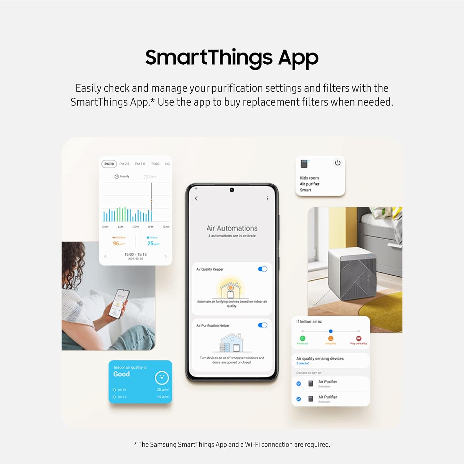 - Filtración HEPA mejorada + aplicación inteligente: el sistema de filtración HEPA multicapa ayuda a atrapar el polvo y eliminar olores**; comprueba y administra fácilmente tus ajustes de purificación y filtros con la aplicación SmartThings y utiliza la aplicación para comprar filtros de repuesto cuando sea necesario