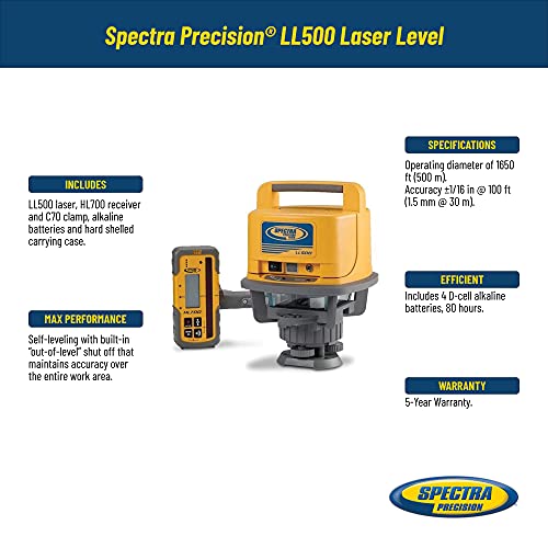 Spectra Precision LL500 Nivel láser autonivelante con receptor HL700, abrazadera de varilla C70, baterías alcalinas, estuche