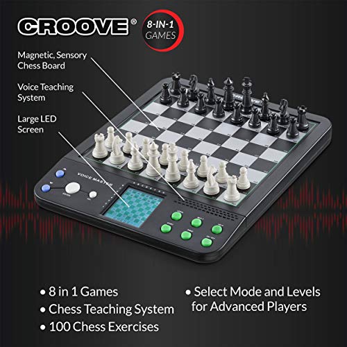 - El paquete contiene tablero, piezas de ajedrez blanco y negro, piezas de damas y un estuche para las piezas cuando no están en uso. Requiere 4 pilas AA (no incluidas)