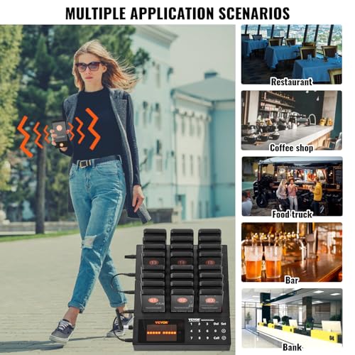 VEVOR Sistema de localización de restaurantes, señal inalámbrica de cola de espera de 1,312.3 ft de largo alcance, cliente invitado que llama a los apicultores con vibración e intermitente, 24 timbres